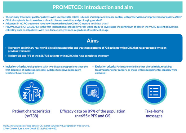 The purpose of PROMETCO is to provide real-world data on overall survival, treatment patterns, associated effectiveness and safety, and impact on patients with mCRC throughout the continuum of care1